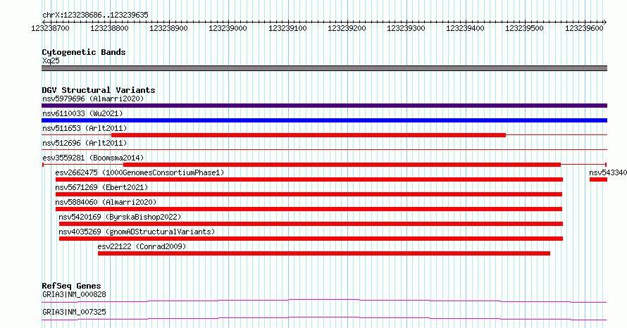 Variant DetailsVariant: esv3559281| Internal ID | 18760357 | | Landmark | | | Location Information | | | Cytoband | Xq25 | | Allele length | | Assembly | Allele length | | hg38 | 950 | | hg19 | 950 |