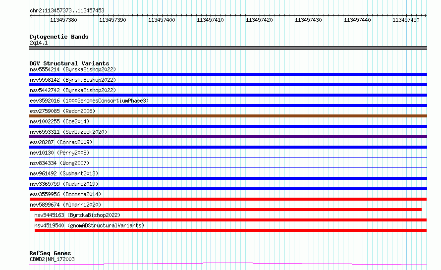 Variant DetailsVariant: esv3559956| Internal ID | 18761032 | | Landmark | | | Location Information | | | Cytoband | 2q13 | | Allele length | | Assembly | Allele length | | hg38 | 81 | | hg19 | 81 |