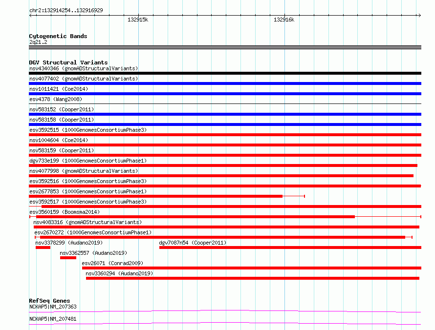 | | Variant Type | CNV deletion | | Copy Number | | | Allele State | | | Allele Origin | | | Probe Count | | | Validation Flag | | | Merged Status | M | | Merged Variants | | | Supporting Variants | essv9758906 | | Samples | | | Known Genes | MIR7853, NCKAP5 | | Method | Sequencing | | Analysis | | | Platform | Illumina HiSeq 2000 | | Comments | | | Reference | Boomsma_et_al_2014 | | Pubmed ID | 23714750 | | Accession Number(s) | esv3560159