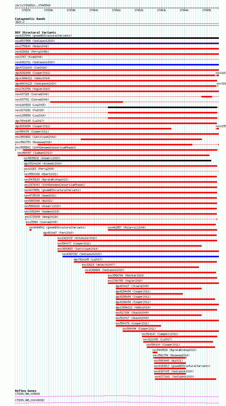 Variant DetailsVariant: esv3561753| Internal ID | 18762829 | | Landmark | | | Location Information | | | Cytoband | 3p22.2 | | Allele length | | Assembly | Allele length | | hg38 | 9000 | | hg19 | 9000 |
