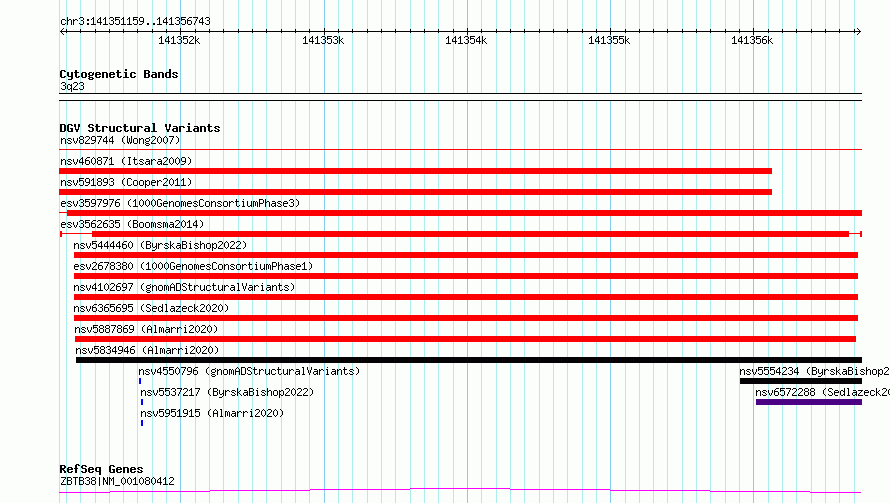 Variant DetailsVariant: esv3562635| Internal ID | 18763711 | | Landmark | | | Location Information | | | Cytoband | 3q23 | | Allele length | | Assembly | Allele length | | hg38 | 5585 | | hg19 | 5585 |