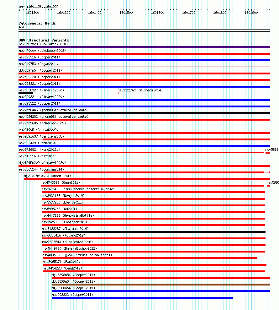 Variant DetailsVariant: esv3563244| Internal ID | 18764320 | | Landmark | | | Location Information | | | Cytoband | 4p16.3 | | Allele length | | Assembly | Allele length | | hg38 | 802 | | hg19 | 802 |