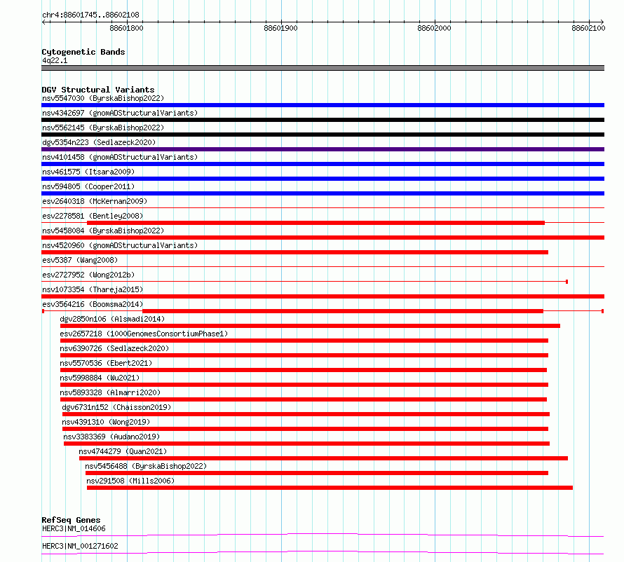 Variant DetailsVariant: esv3564216| Internal ID | 18765292 | | Landmark | | | Location Information | | | Cytoband | 4q22.1 | | Allele length | | Assembly | Allele length | | hg38 | 364 | | hg19 | 364 |