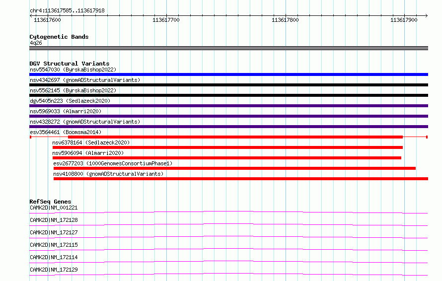| | Variant Type | CNV deletion | | Copy Number | | | Allele State | | | Allele Origin | | | Probe Count | | | Validation Flag | | | Merged Status | M | | Merged Variants | | | Supporting Variants | essv9763208 | | Samples | | | Known Genes | CAMK2D | | Method | Sequencing | | Analysis | | | Platform | Illumina HiSeq 2000 | | Comments | | | Reference | Boomsma_et_al_2014 | | Pubmed ID | 23714750 | | Accession Number(s) | esv3564461