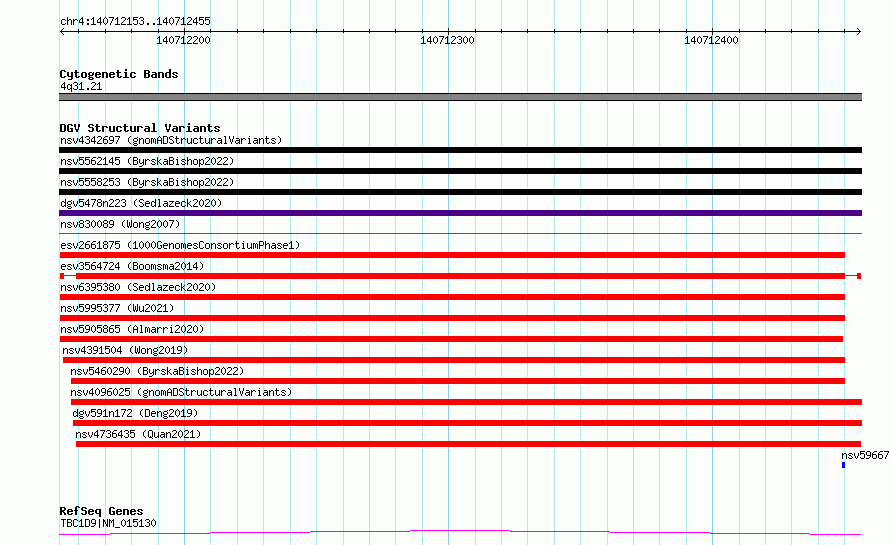 Variant DetailsVariant: esv3564724| Internal ID | 18765800 | | Landmark | | | Location Information | | | Cytoband | 4q31.21 | | Allele length | | Assembly | Allele length | | hg38 | 303 | | hg19 | 303 |