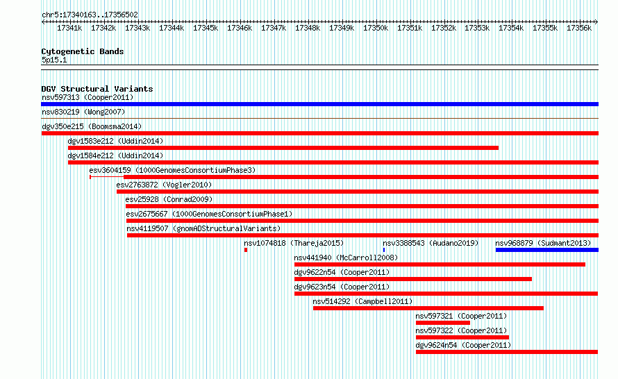 Variant DetailsVariant: esv3565592| Internal ID | 18419982 | | Landmark | | | Location Information | | | Cytoband | 5p15.1 | | Allele length | | Assembly | Allele length | | hg38 | 16340 | | hg19 | 16340 |