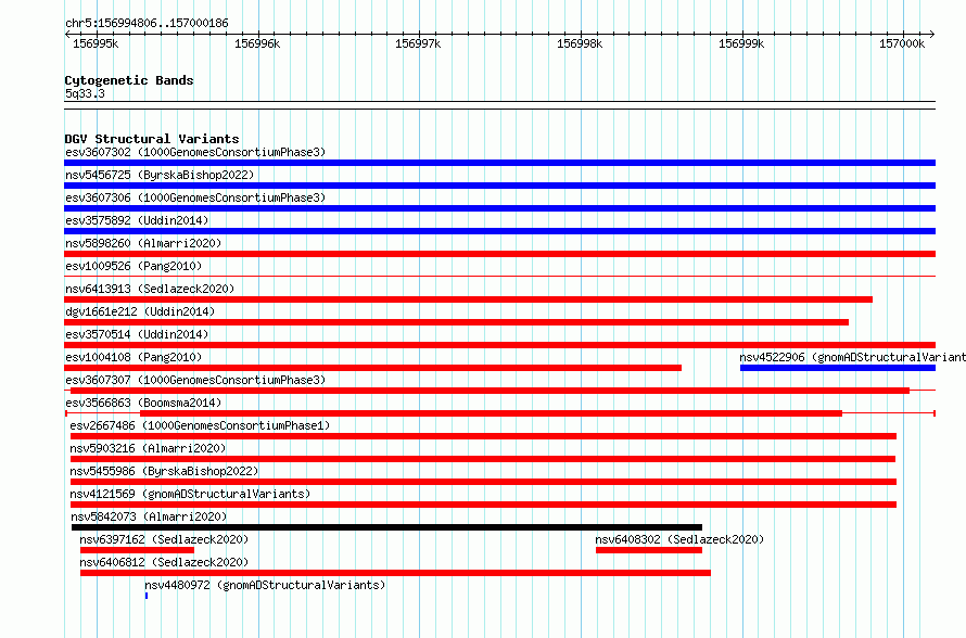 Variant DetailsVariant: esv3566863| Internal ID | 18767939 | | Landmark | | | Location Information | | | Cytoband | 5q33.3 | | Allele length | | Assembly | Allele length | | hg38 | 5381 | | hg19 | 5381 |