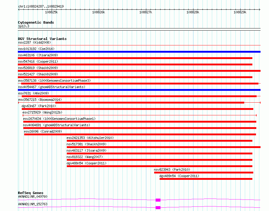 | | Variant Type | CNV deletion | | Copy Number | | | Allele State | | | Allele Origin | | | Probe Count | | | Validation Flag | | | Merged Status | M | | Merged Variants | | | Supporting Variants | essv9765962 | | Samples | | | Known Genes | AKNAD1 | | Method | Sequencing | | Analysis | | | Platform | Illumina HiSeq 2000 | | Comments | | | Reference | Boomsma_et_al_2014 | | Pubmed ID | 23714750 | | Accession Number(s) | esv3567215