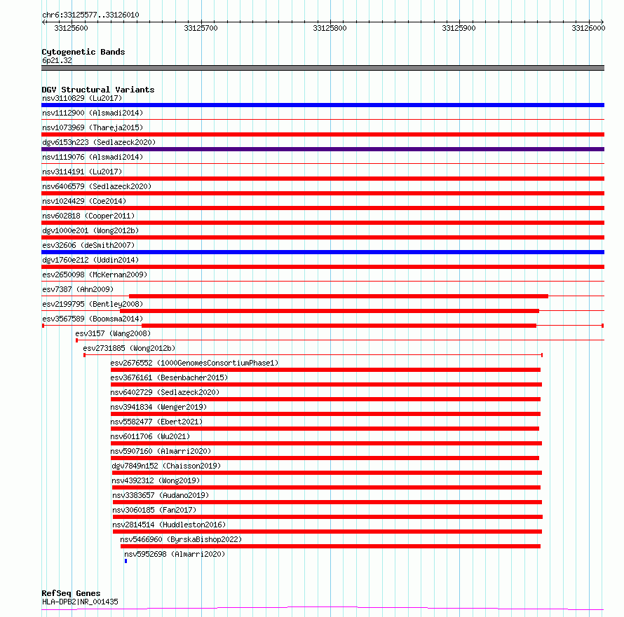 Variant DetailsVariant: esv3567589| Internal ID | 18768665 | | Landmark | | | Location Information | | | Cytoband | 6p21.32 | | Allele length | | Assembly | Allele length | | hg38 | 434 | | hg19 | 434 |