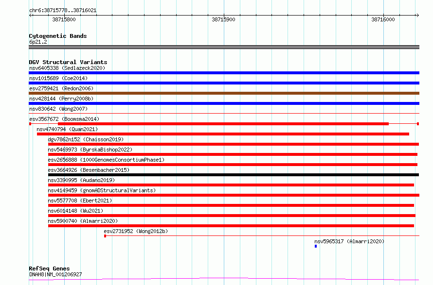 Variant DetailsVariant: esv3567672| Internal ID | 18768748 | | Landmark | | | Location Information | | | Cytoband | 6p21.2 | | Allele length | | Assembly | Allele length | | hg38 | 244 | | hg19 | 244 |