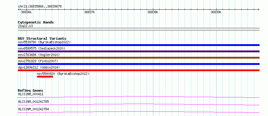 Variant DetailsVariant: esv3568180| Internal ID | 18696378 | | Landmark | | | Location Information | | | Cytoband | 21q22.13 | | Allele length | | Assembly | Allele length | | hg38 | 3813 | | hg19 | 3813 |