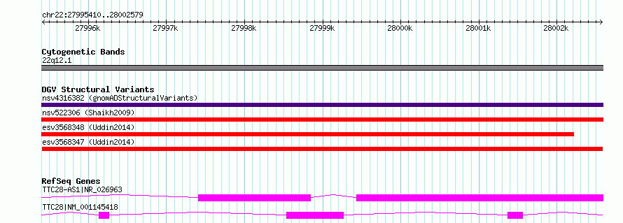 | | Variant Type | CNV loss | | Copy Number | | | Allele State | | | Allele Origin | | | Probe Count | | | Validation Flag | | | Merged Status | M | | Merged Variants | | | Supporting Variants | essv9821991, essv9821992, essv9821993, essv9821994 | | Samples | 401146US, 400265LK, 401696CG, 401254AE | | Known Genes | TTC28, TTC28-AS1 | | Method | SNP array | | Analysis | We used four separate algorithms to detect CNVs; Affymetrix Chromosome Analysis Suite (ChAS), iPattern, Nexus and Partek. Our primary analysis was performed based on ChAS CNV calls, which were then supported using the remaining three algorithms to construct a confidence set of CNVs. For all algorithms, we have used 8 probes and >1kb as a base line cutoff for CNV detection. | | Platform | Affymetrix CytoScan HD 2.7M array | | Comments | | | Reference | Uddin_et_al_2014 | | Pubmed ID | 25503493 | | Accession Number(s) | esv3568347