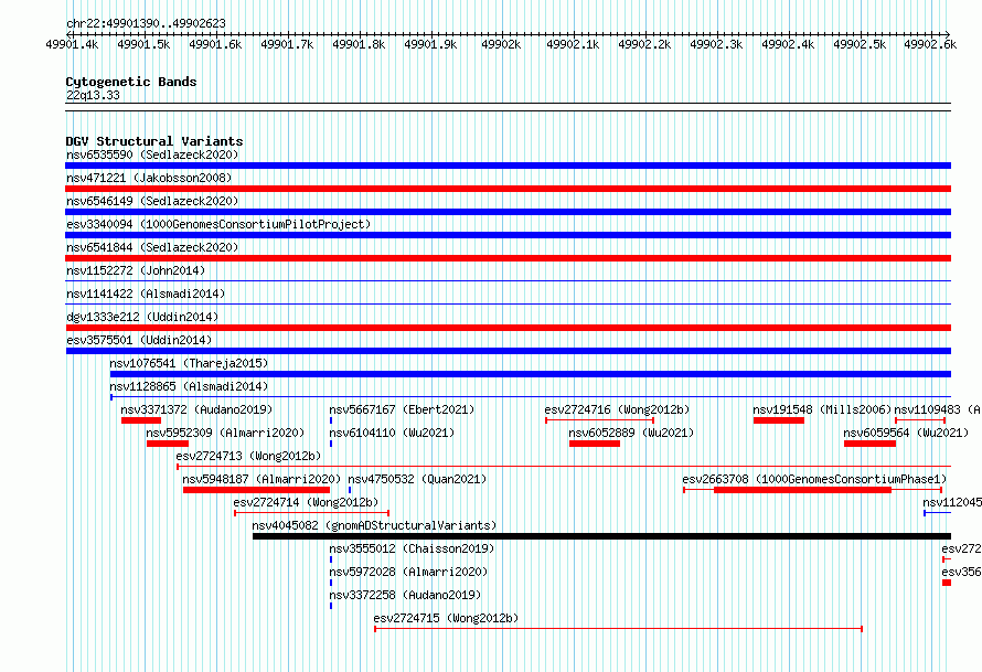 Variant DetailsVariant: esv3568485| Internal ID | 18696683 | | Landmark | | | Location Information | | | Cytoband | 22q13.33 | | Allele length | | Assembly | Allele length | | hg38 | 1234 | | hg19 | 1234 |