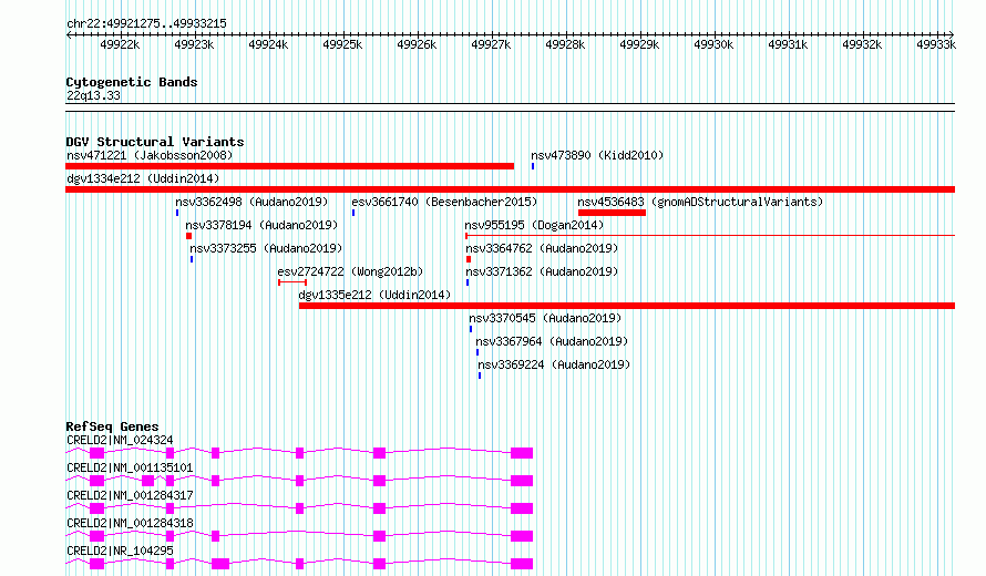 | | Variant Type | CNV loss | | Copy Number | | | Allele State | | | Allele Origin | | | Probe Count | | | Validation Flag | | | Merged Status | M | | Merged Variants | dgv1334e212 | | Supporting Variants | essv9822585, essv9822587, essv9822584, essv9822586, essv9822583 | | Samples | 400737GC, 400002HK, 401386WA, 401438HT, 400778SR | | Known Genes | CRELD2 | | Method | SNP array | | Analysis | We used four separate algorithms to detect CNVs; Affymetrix Chromosome Analysis Suite (ChAS), iPattern, Nexus and Partek. Our primary analysis was performed based on ChAS CNV calls, which were then supported using the remaining three algorithms to construct a confidence set of CNVs. For all algorithms, we have used 8 probes and >1kb as a base line cutoff for CNV detection. | | Platform | Affymetrix CytoScan HD 2.7M array | | Comments | | | Reference | Uddin_et_al_2014 | | Pubmed ID | 25503493 | | Accession Number(s) | esv3568494