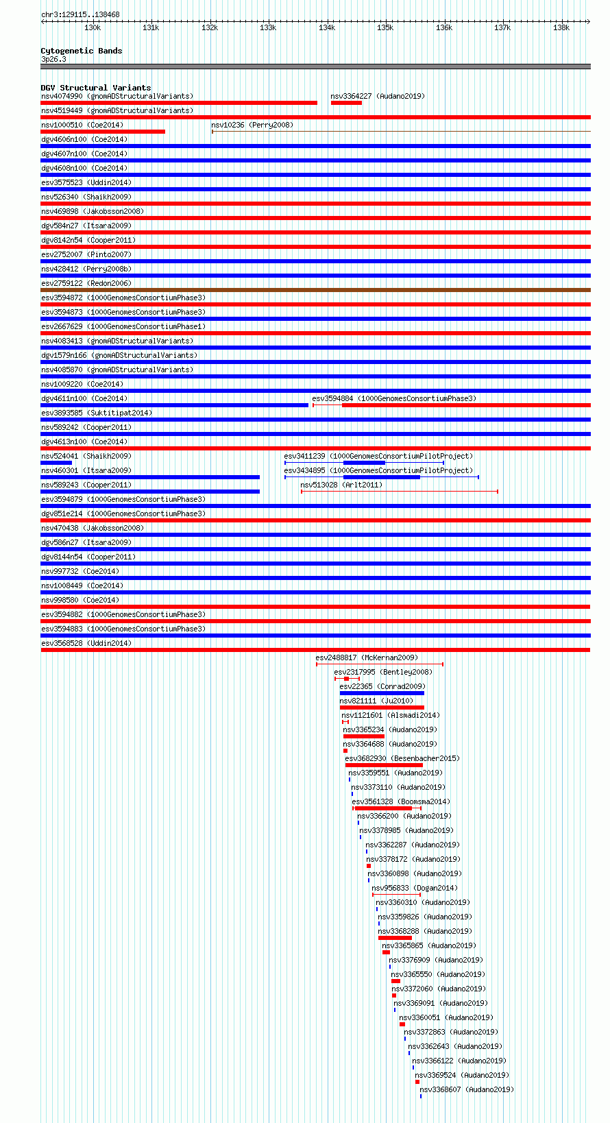 Variant DetailsVariant: esv3568528| Internal ID | 18350040 | | Landmark | | | Location Information | | | Cytoband | 3p26.3 | | Allele length | | Assembly | Allele length | | hg38 | 9354 | | hg19 | 9354 |