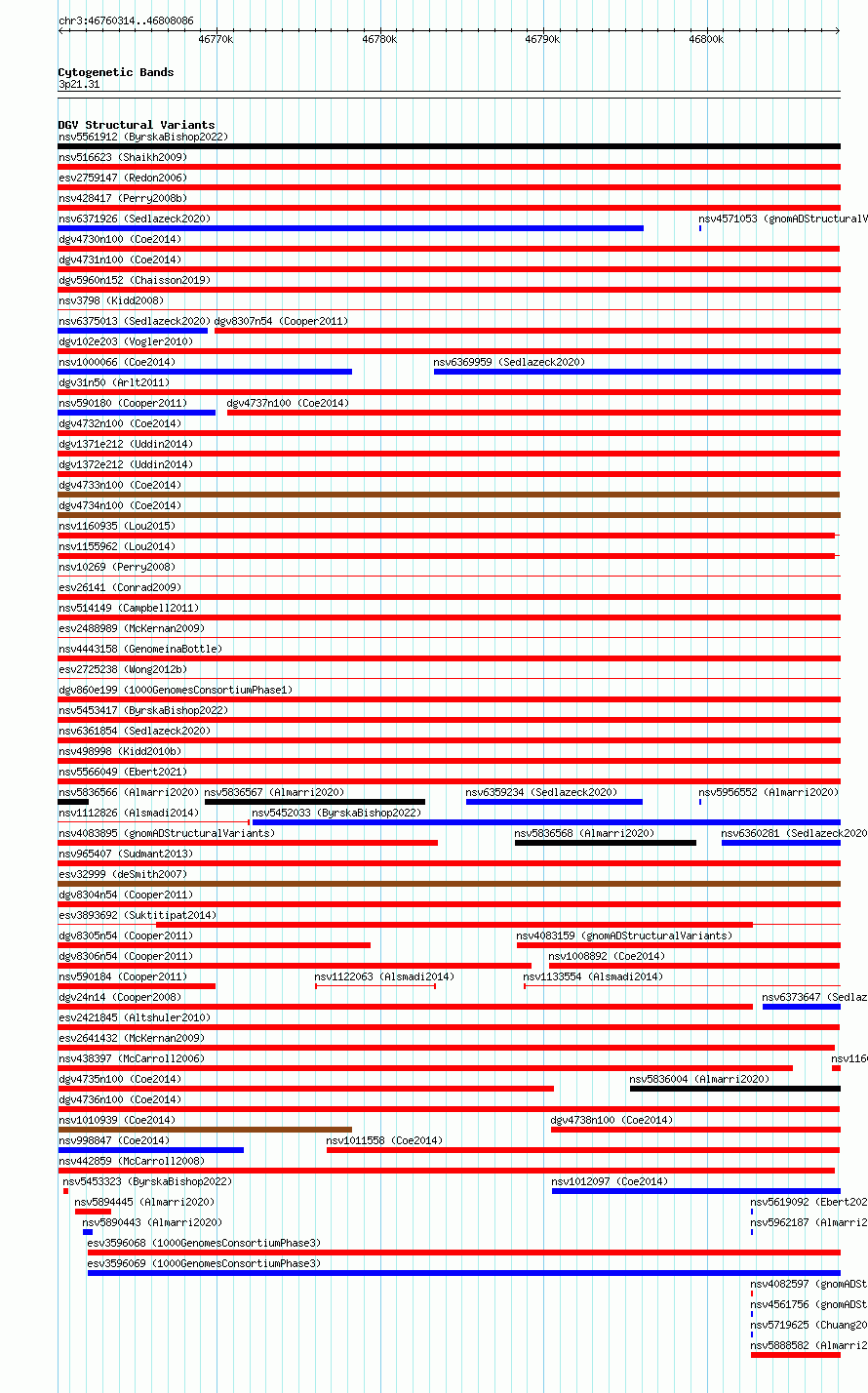 Variant DetailsVariant: esv3568725 | Internal ID | 18696923 | | Landmark | | | Location Information | | | Cytoband | 3p21.31 | | Allele length | | Assembly | Allele length | | hg38 | 47773 | | hg19 | 47773 |