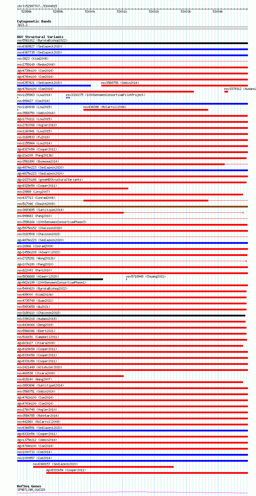 Variant DetailsVariant: esv3568739 | Internal ID | 18696937 | | Landmark | | | Location Information | | | Cytoband | 3p21.1 | | Allele length | | Assembly | Allele length | | hg38 | 7209 | | hg19 | 7209 |