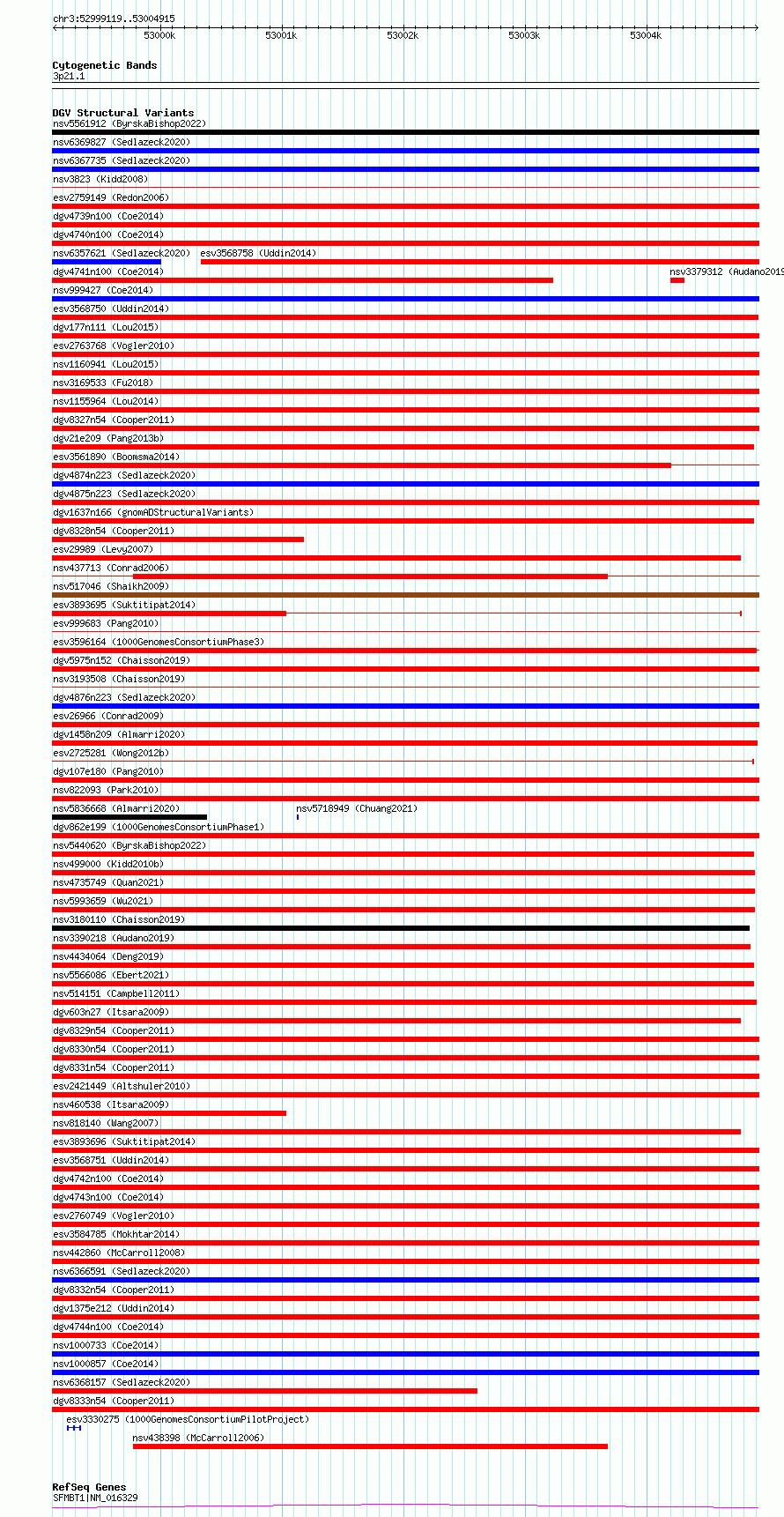 Variant DetailsVariant: esv3568743 | Internal ID | 18696941 | | Landmark | | | Location Information | | | Cytoband | 3p21.1 | | Allele length | | Assembly | Allele length | | hg38 | 5797 | | hg19 | 5797 |