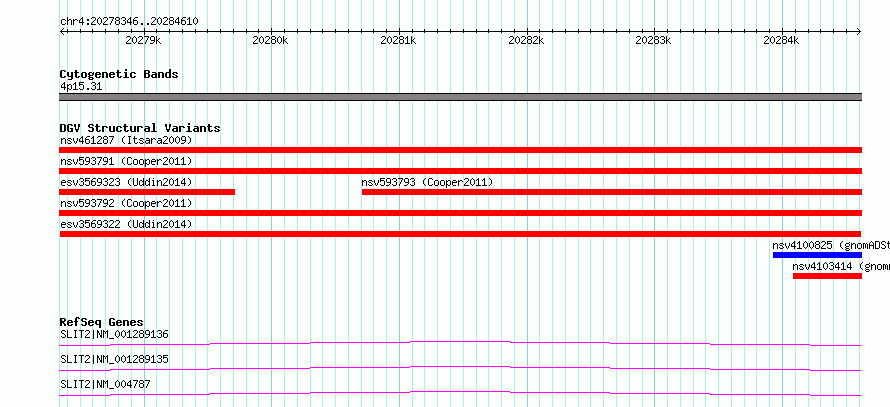 | | Variant Type | CNV loss | | Copy Number | | | Allele State | | | Allele Origin | | | Probe Count | | | Validation Flag | | | Merged Status | M | | Merged Variants | | | Supporting Variants | essv9770326, essv9770325 | | Samples | 400739SS, 400070PC | | Known Genes | SLIT2 | | Method | SNP array | | Analysis | We used four separate algorithms to detect CNVs; Affymetrix Chromosome Analysis Suite (ChAS), iPattern, Nexus and Partek. Our primary analysis was performed based on ChAS CNV calls, which were then supported using the remaining three algorithms to construct a confidence set of CNVs. For all algorithms, we have used 8 probes and >1kb as a base line cutoff for CNV detection. | | Platform | Affymetrix CytoScan HD 2.7M array | | Comments | | | Reference | Uddin_et_al_2014 | | Pubmed ID | 25503493 | | Accession Number(s) | esv3569322