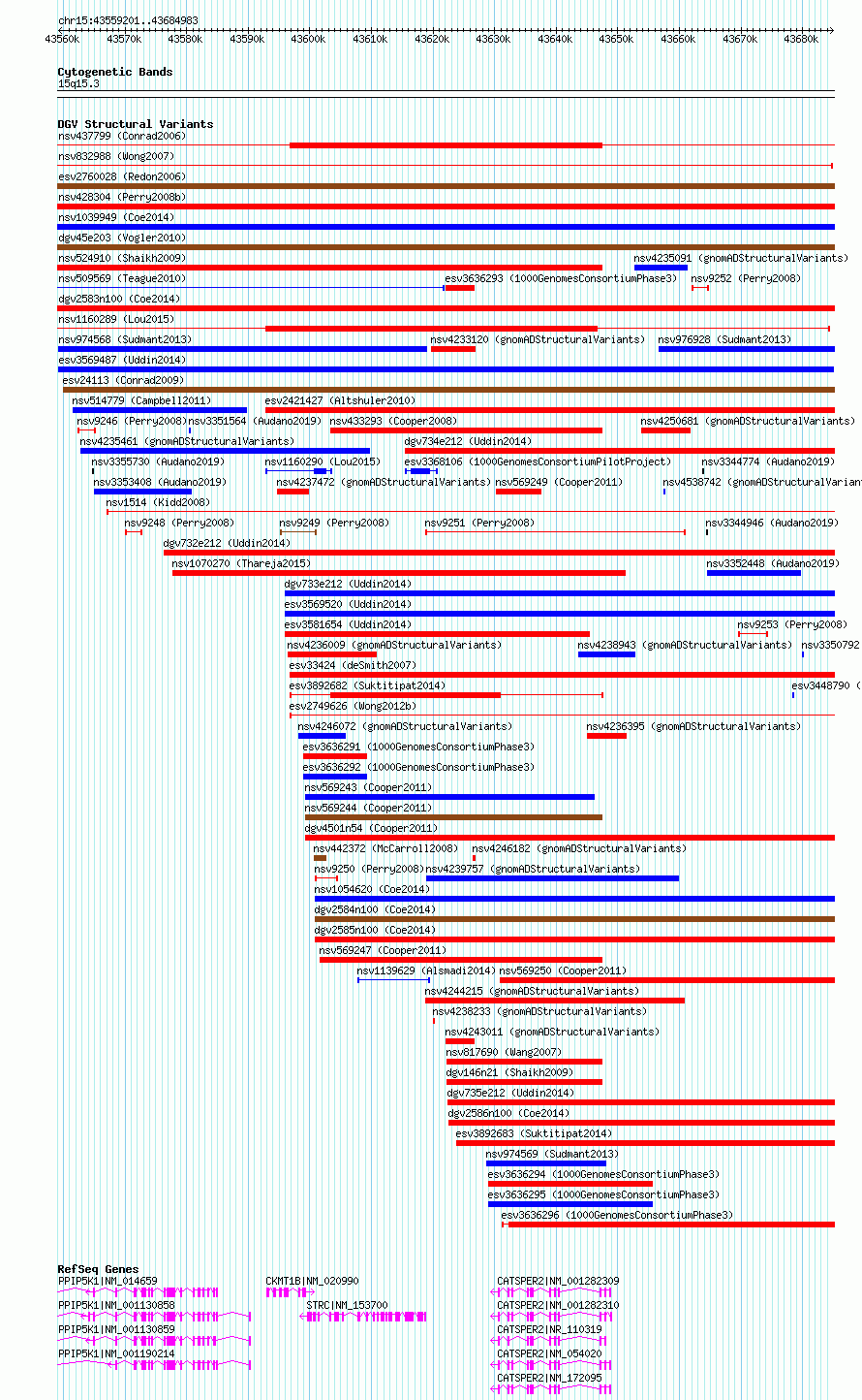 Variant DetailsVariant: esv3569487| Internal ID | 18350999 | | Landmark | | | Location Information | | | Cytoband | 15q15.3 | | Allele length | | Assembly | Allele length | | hg38 | 125783 | | hg19 | 125783 |
