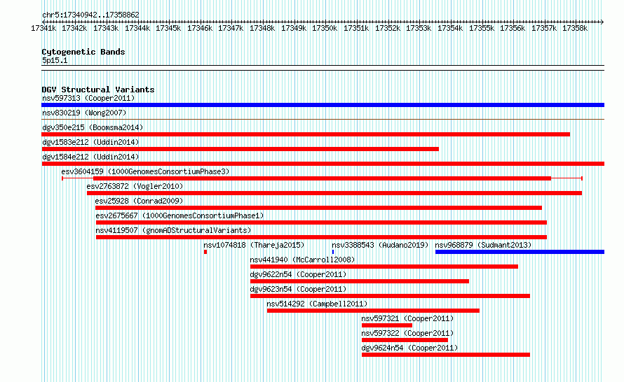 Variant DetailsVariant: esv3570015| Internal ID | 18351527 | | Landmark | | | Location Information | | | Cytoband | 5p15.1 | | Allele length | | Assembly | Allele length | | hg38 | 17921 | | hg19 | 17921 |