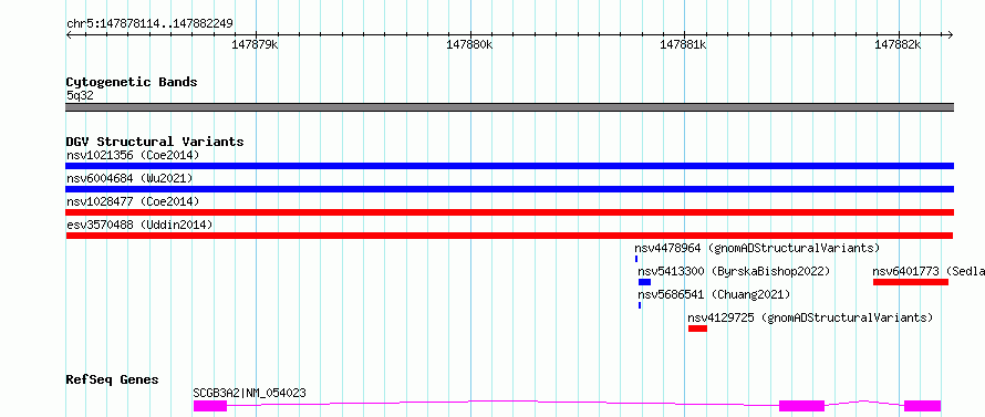 Variant DetailsVariant: esv3570488| Internal ID | 18698686 | | Landmark | | | Location Information | | | Cytoband | 5q32 | | Allele length | | Assembly | Allele length | | hg38 | 4136 | | hg19 | 4136 |