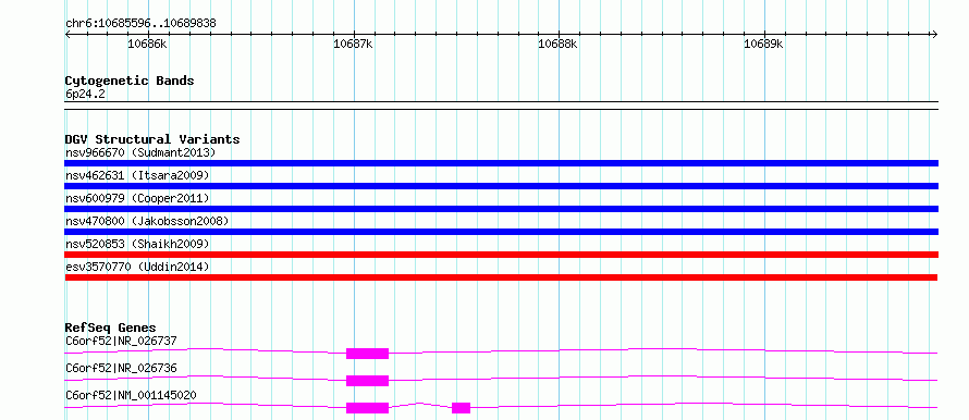 Variant DetailsVariant: esv3570770| Internal ID | 18352282 | | Landmark | | | Location Information | | | Cytoband | 6p24.2 | | Allele length | | Assembly | Allele length | | hg38 | 4243 | | hg19 | 4243 |