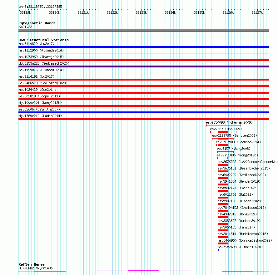 Variant DetailsVariant: esv3570998| Internal ID | 18699196 | | Landmark | | | Location Information | | | Cytoband | 6p21.32 | | Allele length | | Assembly | Allele length | | hg38 | 8621 | | hg19 | 8621 |