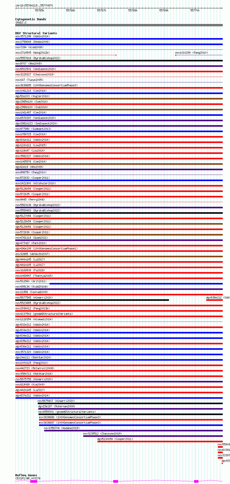 Variant DetailsVariant: esv3571208 | Internal ID | 18699406 | | Landmark | | | Location Information | | | Cytoband | 16q12.2 | | Allele length | | Assembly | Allele length | | hg38 | 6652 | | hg19 | 6652 |