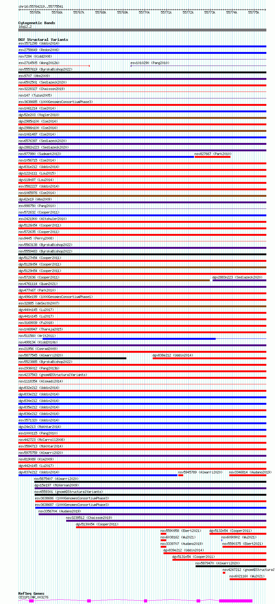 Variant DetailsVariant: esv3571219 | Internal ID | 18699417 | | Landmark | | | Location Information | | | Cytoband | 16q12.2 | | Allele length | | Assembly | Allele length | | hg38 | 11323 | | hg19 | 11323 |