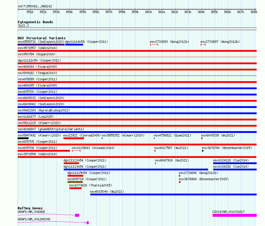 Variant DetailsVariant: esv3571558| Internal ID | 18699756 | | Landmark | | | Location Information | | | Cytoband | 7p22.3 | | Allele length | | Assembly | Allele length | | hg38 | 18082 | | hg19 | 18082 |