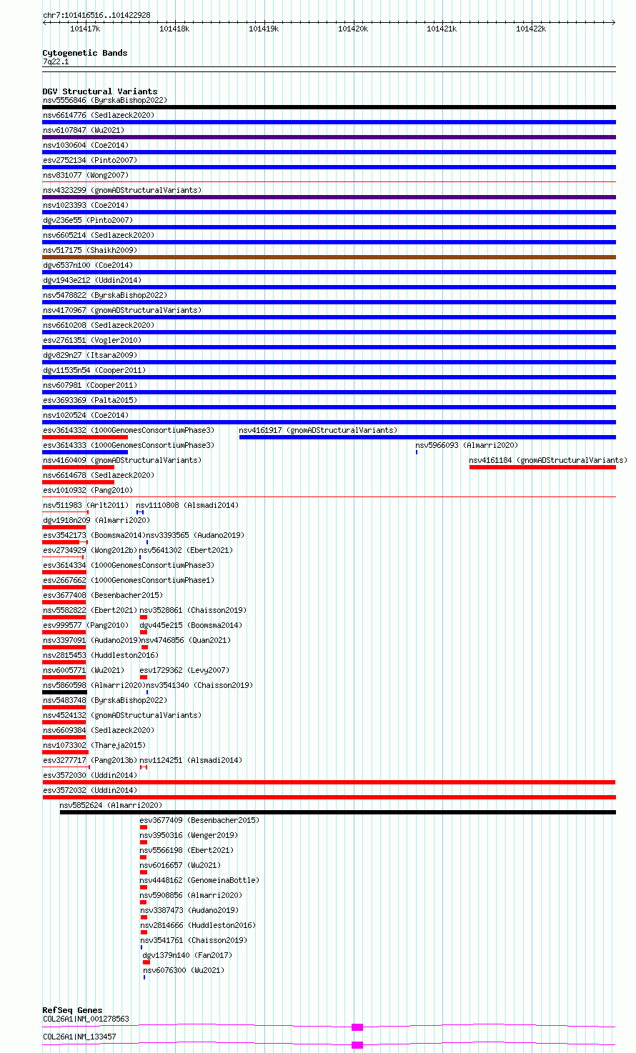 Variant DetailsVariant: esv3572030| Internal ID | 18700228 | | Landmark | | | Location Information | | | Cytoband | 7q22.1 | | Allele length | | Assembly | Allele length | | hg38 | 6413 | | hg19 | 6413 |