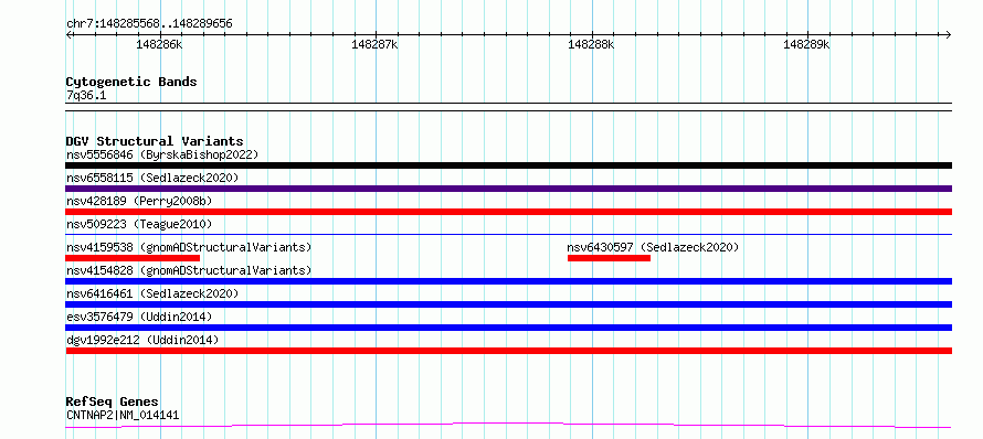 | | Variant Type | CNV loss | | Copy Number | | | Allele State | | | Allele Origin | | | Probe Count | | | Validation Flag | | | Merged Status | M | | Merged Variants | dgv1992e212 | | Supporting Variants | essv9785903, essv9785895, essv9785909, essv9785907, essv9785908, essv9785898, essv9785897, essv9785901, essv9785912, essv9785902, essv9785906, essv9785905, essv9785910, essv9785899, essv9785896, essv9785894, essv9785904 | | Samples | 400908PJ, 400449PK, 401104DM, 400579HJ, 400270BD, 400082SD, 401968HL, 401318AV, 401859GS, 401419SW, 400047DS, 401580CA, 401410BJ, 400501SJ, 401728WK, 400661AD, 400209BS | | Known Genes | CNTNAP2, MIR548T | | Method | SNP array | | Analysis | We used four separate algorithms to detect CNVs; Affymetrix Chromosome Analysis Suite (ChAS), iPattern, Nexus and Partek. Our primary analysis was performed based on ChAS CNV calls, which were then supported using the remaining three algorithms to construct a confidence set of CNVs. For all algorithms, we have used 8 probes and >1kb as a base line cutoff for CNV detection. | | Platform | Affymetrix CytoScan HD 2.7M array | | Comments | | | Reference | Uddin_et_al_2014 | | Pubmed ID | 25503493 | | Accession Number(s) | esv3572284