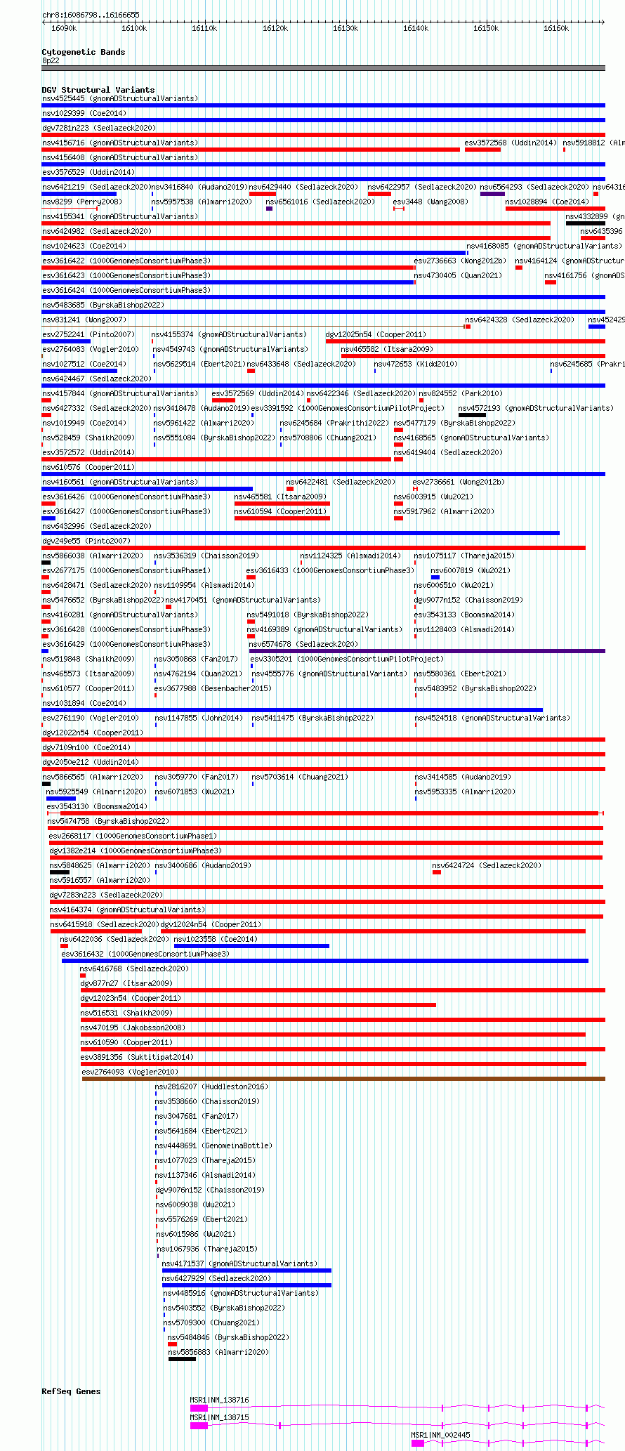 Variant DetailsVariant: esv3572570| Internal ID | 18700768 | | Landmark | | | Location Information | | | Cytoband | 8p22 | | Allele length | | Assembly | Allele length | | hg38 | 79858 | | hg19 | 79858 |