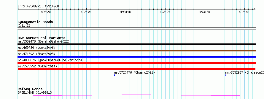 Variant DetailsVariant: esv3573952 | Internal ID | 18702150 | | Landmark | | | Location Information | | | Cytoband | Xp11.23 | | Allele length | | Assembly | Allele length | | hg38 | 5997 | | hg19 | 5997 |