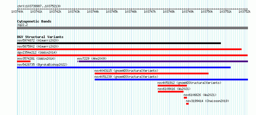 Variant DetailsVariant: esv3574280| Internal ID | 18702478 | | Landmark | | | Location Information | | | Cytoband | Xq22.2 | | Allele length | | Assembly | Allele length | | hg38 | 12144 | | hg19 | 12144 |