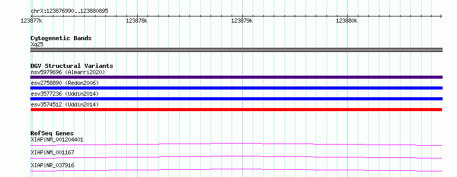 | | Variant Type | CNV loss | | Copy Number | | | Allele State | | | Allele Origin | | | Probe Count | | | Validation Flag | | | Merged Status | M | | Merged Variants | | | Supporting Variants | essv9830238, essv9830237 | | Samples | 401498HH, 400730SH | | Known Genes | XIAP | | Method | SNP array | | Analysis | We used four separate algorithms to detect CNVs; Affymetrix Chromosome Analysis Suite (ChAS), iPattern, Nexus and Partek. Our primary analysis was performed based on ChAS CNV calls, which were then supported using the remaining three algorithms to construct a confidence set of CNVs. For all algorithms, we have used 8 probes and >1kb as a base line cutoff for CNV detection. | | Platform | Affymetrix CytoScan HD 2.7M array | | Comments | | | Reference | Uddin_et_al_2014 | | Pubmed ID | 25503493 | | Accession Number(s) | esv3574512