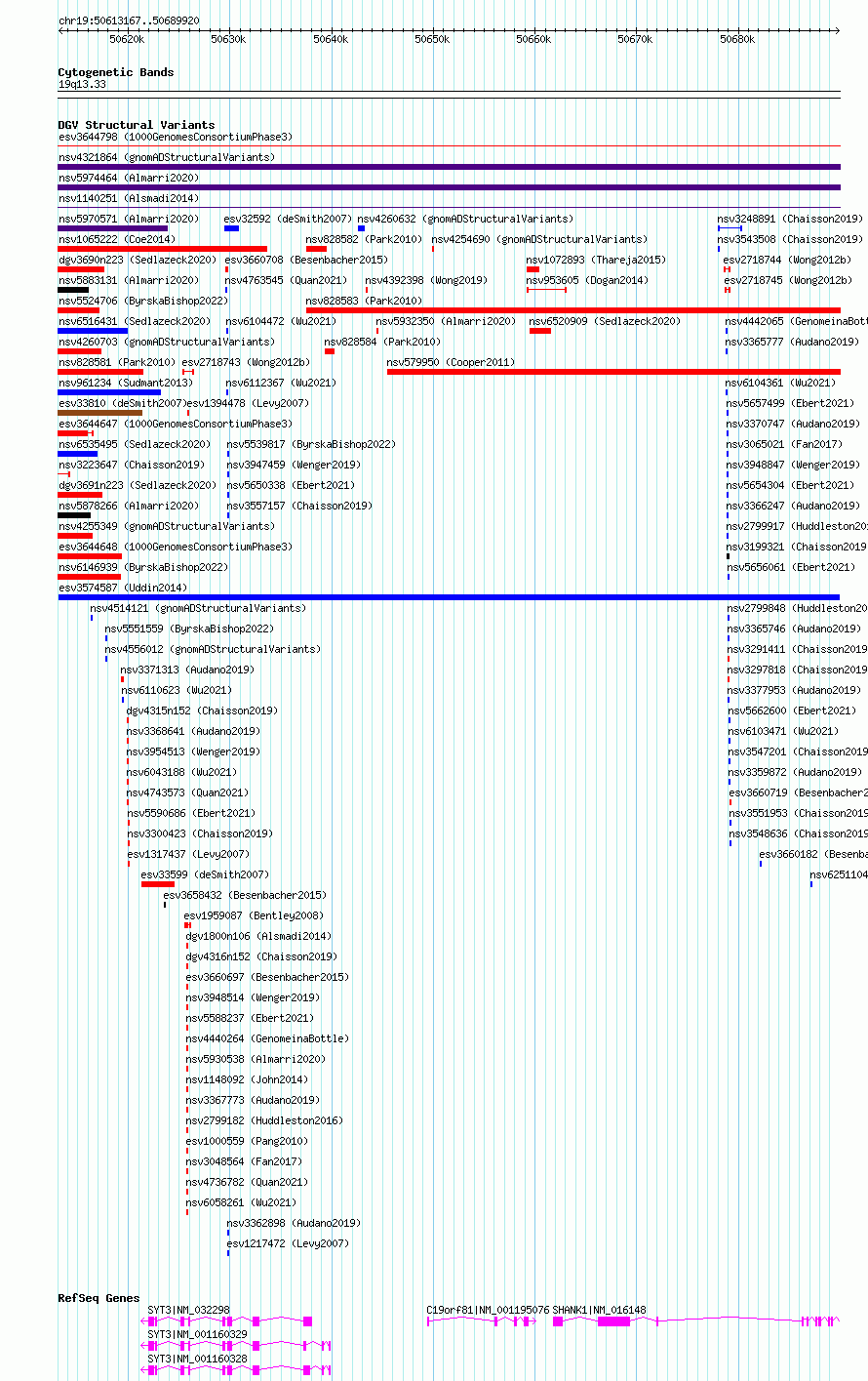 Variant DetailsVariant: esv3574587| Internal ID | 18702785 | | Landmark | | | Location Information | | | Cytoband | 19q13.33 | | Allele length | | Assembly | Allele length | | hg38 | 76754 | | hg19 | 76754 |