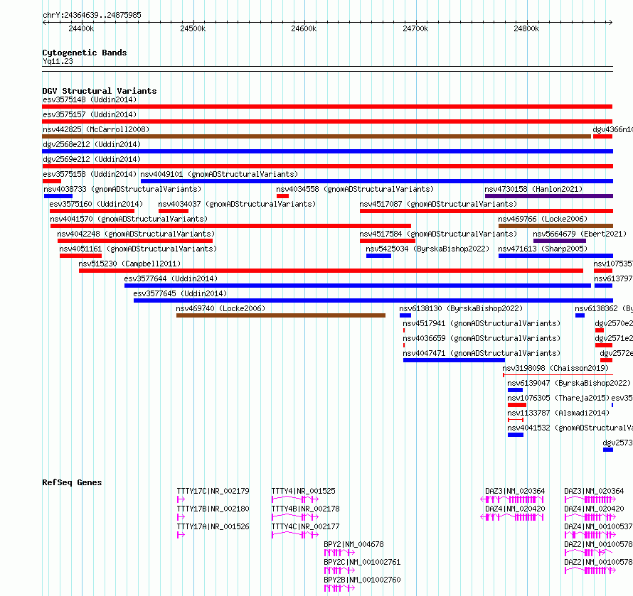 Variant DetailsVariant: esv3575159| Internal ID | 18703357 | | Landmark | | | Location Information | | | Cytoband | Yq11.23 | | Allele length | | Assembly | Allele length | | hg38 | 511347 | | hg19 | 511347 |