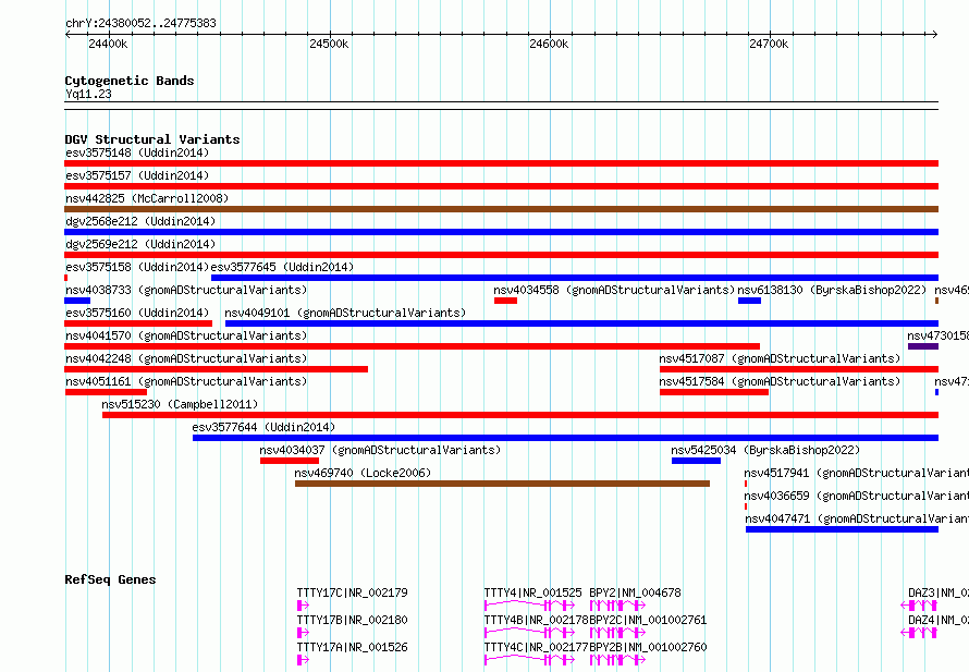 Variant DetailsVariant: esv3575163| Internal ID | 18703361 | | Landmark | | | Location Information | | | Cytoband | Yq11.23 | | Allele length | | Assembly | Allele length | | hg38 | 395332 | | hg19 | 395332 |