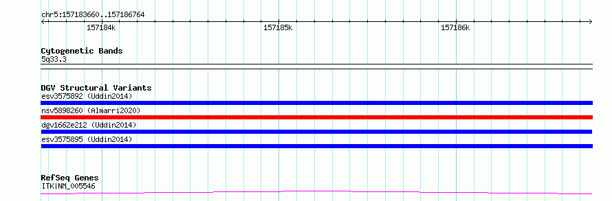 | | Variant Type | CNV gain | | Copy Number | | | Allele State | | | Allele Origin | | | Probe Count | | | Validation Flag | | | Merged Status | M | | Merged Variants | dgv1662e212 | | Supporting Variants | essv9776603, essv9776596, essv9776604, essv9776605, essv9776598, essv9776606, essv9776595, essv9776608, essv9776602, essv9776600, essv9776597, essv9776607, essv9776601 | | Samples | 400739SS, 400083TG, 401030GI, 400344DR, 400663MD, 401251WN, 400082SD, 402074RR, 401369GR, 401016IT, 401861GG, 401056TJ, 401372RR | | Known Genes | ITK | | Method | SNP array | | Analysis | We used four separate algorithms to detect CNVs; Affymetrix Chromosome Analysis Suite (ChAS), iPattern, Nexus and Partek. Our primary analysis was performed based on ChAS CNV calls, which were then supported using the remaining three algorithms to construct a confidence set of CNVs. For all algorithms, we have used 8 probes and >1kb as a base line cutoff for CNV detection. | | Platform | Affymetrix CytoScan HD 2.7M array | | Comments | | | Reference | Uddin_et_al_2014 | | Pubmed ID | 25503493 | | Accession Number(s) | esv3575891