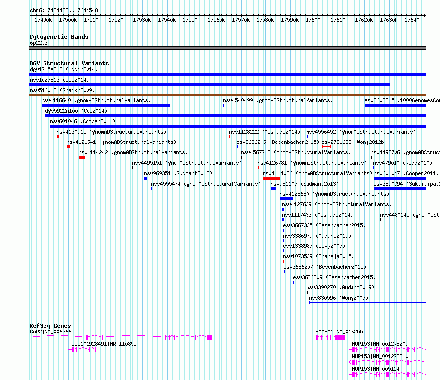 | Variant Type | CNV gain | Copy Number | | Allele State | | Allele Origin | | Probe Count | | Validation Flag | | Merged Status | M | Merged Variants | dgv1715e212 | Supporting Variants | essv9778176 | Samples | 401357MH | Known Genes | CAP2, FAM8A1, NUP153 | Method | SNP array | Analysis | We used four separate algorithms to detect CNVs; Affymetrix Chromosome Analysis Suite (ChAS), iPattern, Nexus and Partek. Our primary analysis was performed based on ChAS CNV calls, which were then supported using the remaining three algorithms to construct a confidence set of CNVs. For all algorithms, we have used 8 probes and >1kb as a base line cutoff for CNV detection. | Platform | Affymetrix CytoScan HD 2.7M array | Comments | | Reference | Uddin_et_al_2014 | Pubmed ID | 25503493 | Accession Number(s) | esv3576101