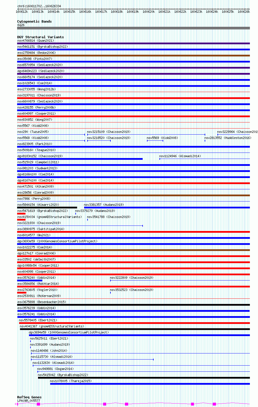 Variant DetailsVariant: esv3576239 | Internal ID | 18704437 | | Landmark | | | Location Information | | | Cytoband | 6q26 | | Allele length | | Assembly | Allele length | | hg38 | 14633 | | hg19 | 14633 |