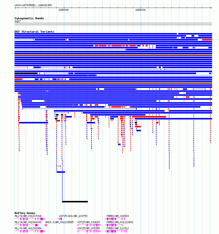 | | Variant Type | CNV gain | | Copy Number | | | Allele State | | | Allele Origin | | | Probe Count | | | Validation Flag | | | Merged Status | M | | Merged Variants | dgv1853e212 | | Supporting Variants | essv9782660, essv9782659 | | Samples | 400977SC, 400315DA | | Known Genes | FRMD1, HGC6.3, KIF25, KIF25-AS1, MLLT4 | | Method | SNP array | | Analysis | We used four separate algorithms to detect CNVs; Affymetrix Chromosome Analysis Suite (ChAS), iPattern, Nexus and Partek. Our primary analysis was performed based on ChAS CNV calls, which were then supported using the remaining three algorithms to construct a confidence set of CNVs. For all algorithms, we have used 8 probes and >1kb as a base line cutoff for CNV detection. | | Platform | Affymetrix CytoScan HD 2.7M array | | Comments | | | Reference | Uddin_et_al_2014 | | Pubmed ID | 25503493 | | Accession Number(s) | esv3576254