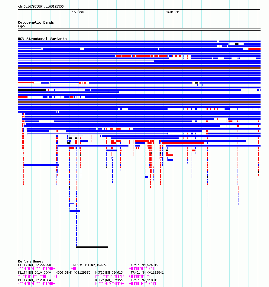| | Variant Type | CNV gain | | Copy Number | | | Allele State | | | Allele Origin | | | Probe Count | | | Validation Flag | | | Merged Status | M | | Merged Variants | dgv1853e212 | | Supporting Variants | essv9782657, essv9782655 | | Samples | 401838EN, 401395OP | | Known Genes | FRMD1, HGC6.3, KIF25, KIF25-AS1, MLLT4 | | Method | SNP array | | Analysis | We used four separate algorithms to detect CNVs; Affymetrix Chromosome Analysis Suite (ChAS), iPattern, Nexus and Partek. Our primary analysis was performed based on ChAS CNV calls, which were then supported using the remaining three algorithms to construct a confidence set of CNVs. For all algorithms, we have used 8 probes and >1kb as a base line cutoff for CNV detection. | | Platform | Affymetrix CytoScan HD 2.7M array | | Comments | | | Reference | Uddin_et_al_2014 | | Pubmed ID | 25503493 | | Accession Number(s) | esv3576256
