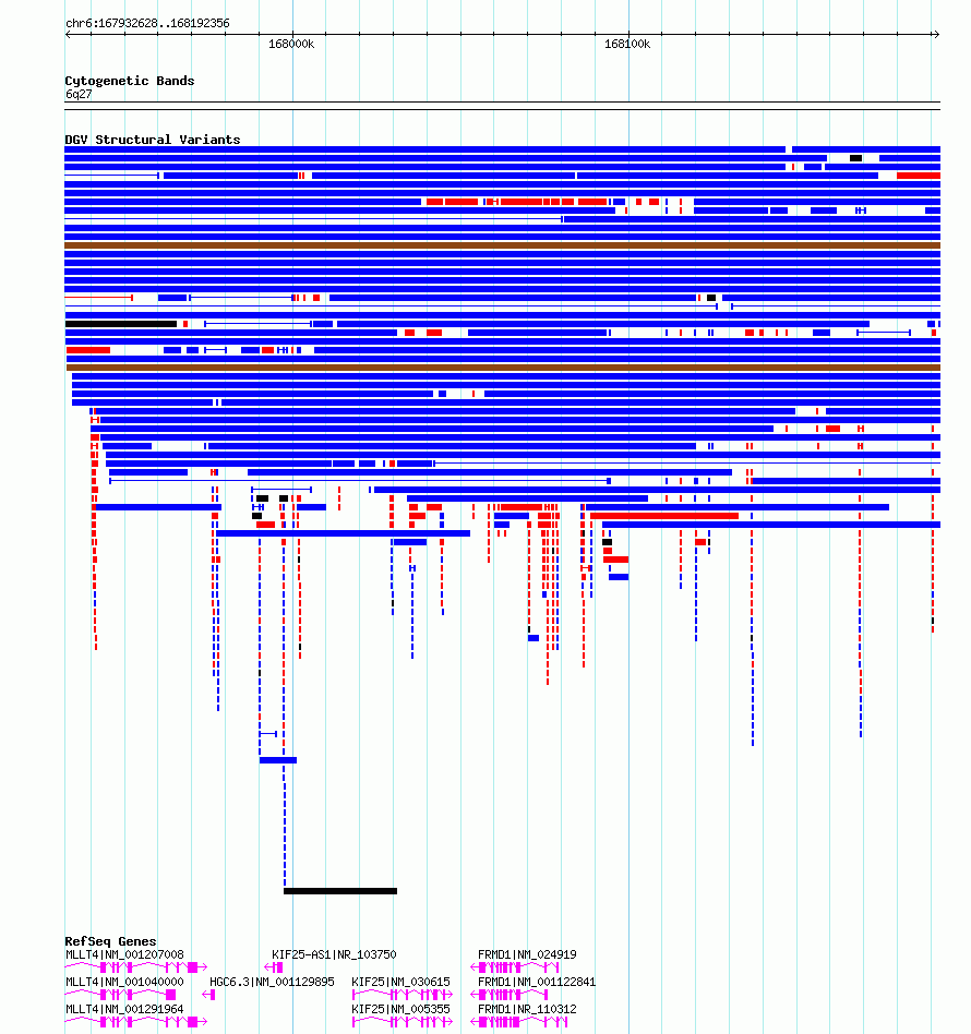 | | Variant Type | CNV gain | | Copy Number | | | Allele State | | | Allele Origin | | | Probe Count | | | Validation Flag | | | Merged Status | M | | Merged Variants | dgv1853e212 | | Supporting Variants | essv9782647, essv9782642, essv9782643, essv9782646 | | Samples | 401591BE, 400375KA, 401514BA, 401958MF | | Known Genes | FRMD1, HGC6.3, KIF25, KIF25-AS1, MLLT4 | | Method | SNP array | | Analysis | We used four separate algorithms to detect CNVs; Affymetrix Chromosome Analysis Suite (ChAS), iPattern, Nexus and Partek. Our primary analysis was performed based on ChAS CNV calls, which were then supported using the remaining three algorithms to construct a confidence set of CNVs. For all algorithms, we have used 8 probes and >1kb as a base line cutoff for CNV detection. | | Platform | Affymetrix CytoScan HD 2.7M array | | Comments | | | Reference | Uddin_et_al_2014 | | Pubmed ID | 25503493 | | Accession Number(s) | esv3576257