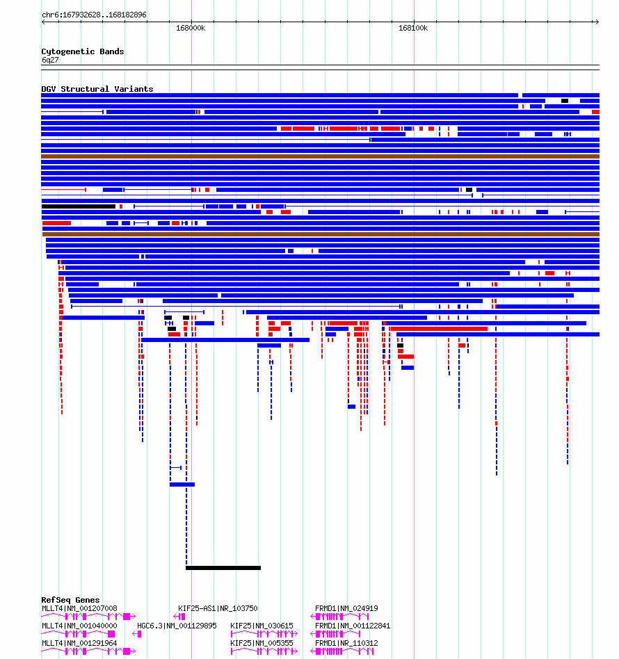 Variant DetailsVariant: esv3576264| Internal ID | 18704462 | | Landmark | | | Location Information | | | Cytoband | 6q27 | | Allele length | | Assembly | Allele length | | hg38 | 250269 | | hg19 | 250269 |