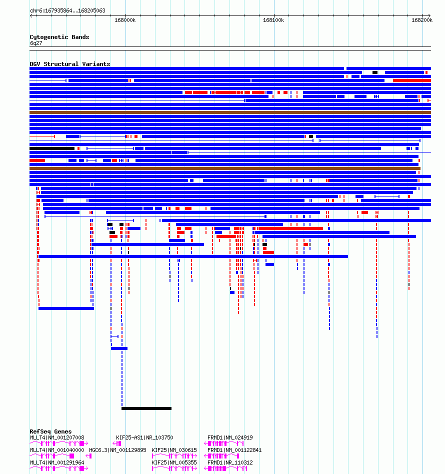 | | Variant Type | CNV gain | | Copy Number | | | Allele State | | | Allele Origin | | | Probe Count | | | Validation Flag | | | Merged Status | M | | Merged Variants | dgv1853e212 | | Supporting Variants | essv9782658 | | Samples | 400482MD | | Known Genes | FRMD1, HGC6.3, KIF25, KIF25-AS1, MLLT4 | | Method | SNP array | | Analysis | We used four separate algorithms to detect CNVs; Affymetrix Chromosome Analysis Suite (ChAS), iPattern, Nexus and Partek. Our primary analysis was performed based on ChAS CNV calls, which were then supported using the remaining three algorithms to construct a confidence set of CNVs. For all algorithms, we have used 8 probes and >1kb as a base line cutoff for CNV detection. | | Platform | Affymetrix CytoScan HD 2.7M array | | Comments | | | Reference | Uddin_et_al_2014 | | Pubmed ID | 25503493 | | Accession Number(s) | esv3576268
