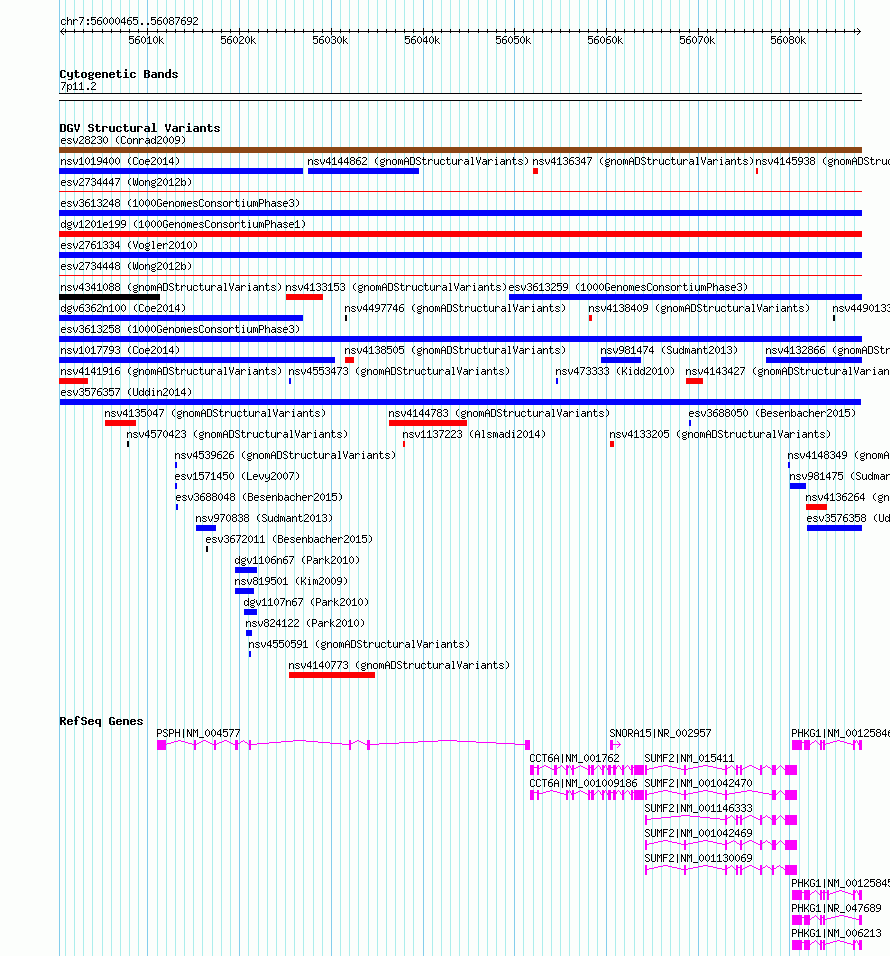 Variant DetailsVariant: esv3576357| Internal ID | 18357869 | | Landmark | | | Location Information | | | Cytoband | 7p11.2 | | Allele length | | Assembly | Allele length | | hg38 | 87228 | | hg19 | 87228 |