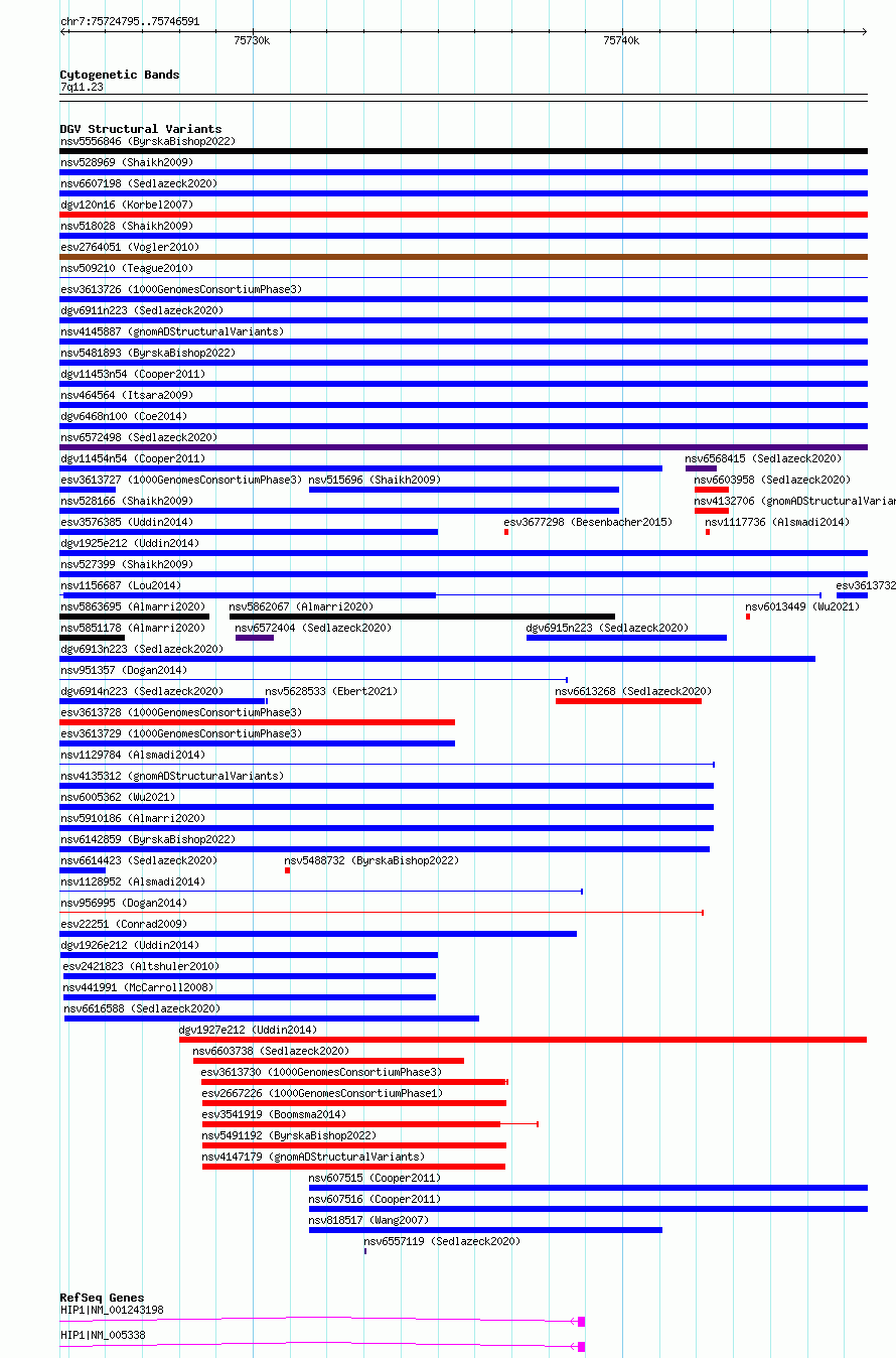 | | Variant Type | CNV gain | | Copy Number | | | Allele State | | | Allele Origin | | | Probe Count | | | Validation Flag | | | Merged Status | M | | Merged Variants | dgv1925e212 | | Supporting Variants | essv9784179, essv9784189, essv9784182, essv9784186, essv9784187, essv9784183, essv9784184, essv9784181, essv9784173, essv9784175, essv9784180, essv9784176, essv9784172, essv9784174, essv9784170, essv9784171, essv9784178, essv9784185 | | Samples | 401706BJ, 400439IM, 400821FE, 400876OG, 401036WS, 400141CC, 400834SS, 401820SD, 401006ES, 401239PR, 401726LW, 401586RS, 401879HJ, 400639RP, 401861GG, 401152MV, 400982BS, 401482CB | | Known Genes | HIP1 | | Method | SNP array | | Analysis | We used four separate algorithms to detect CNVs; Affymetrix Chromosome Analysis Suite (ChAS), iPattern, Nexus and Partek. Our primary analysis was performed based on ChAS CNV calls, which were then supported using the remaining three algorithms to construct a confidence set of CNVs. For all algorithms, we have used 8 probes and >1kb as a base line cutoff for CNV detection. | | Platform | Affymetrix CytoScan HD 2.7M array | | Comments | | | Reference | Uddin_et_al_2014 | | Pubmed ID | 25503493 | | Accession Number(s) | esv3576380